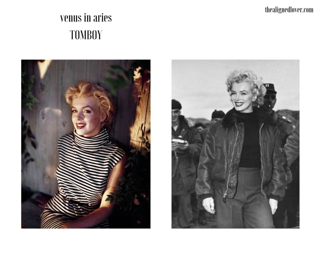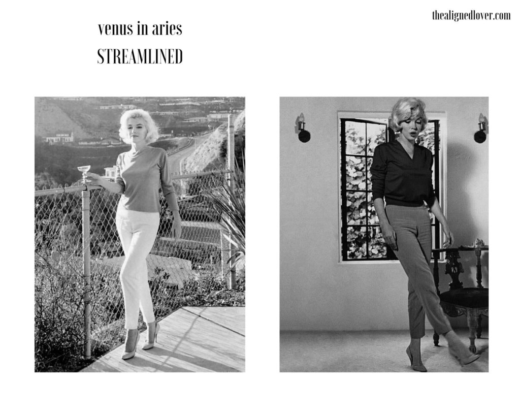 Though immortalized in the modern psyche as a baby-talking set of curves adorned in anything shimmery and slinky, I argue that Marilyn seems to look more interesting and more dynamic in the Venus in Aries friendly outfits below. Without the costuming, Marilyn the caricature fades away and Marilyn, or arguably Norma Jean, gets to breathe and flash some knowing looks that are far from that wide-eyed clueless stare.