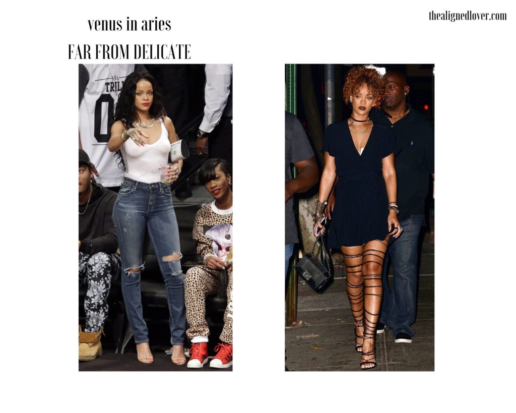 Here we have Rihanna in another ripped jeans, sleek single strapped heel, and fire engine lipstick ensemble. Although the outfit is almost stripped to the bare essentials, it looks far from underwhelming or boring on her. Her Venus in Aries energy radiates best through in-your-face sensuality that reads more active than receptive. On the right, her strappy super-extended heels, choker, dark lipstick, and clean cut dress are another prime example of the Aries simple but potent sensuality on display.