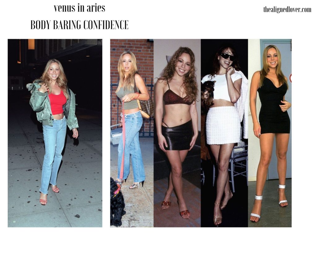 Mariah Carey in another Venus in Aries native who thrives off body baring looks that read a little rugged. Faded skin tight jeans and a bra-less low cut tank top seem to be an unconscious Venus in Aries uniform- perfect for comfortably and attractively challenging the normative gender roles that decide who does the chasing. (Though females with this placement are more naturally inclined to pursue, they tend to only truly respect someone who either outdoes them or stuns them into receptivity…but that is another video). Add some mid-riff baring crop tops, mini skirts and a clean outline (clutter and intricate detail do not fare well for this native) and the Venus in Aries wardrobe is content.