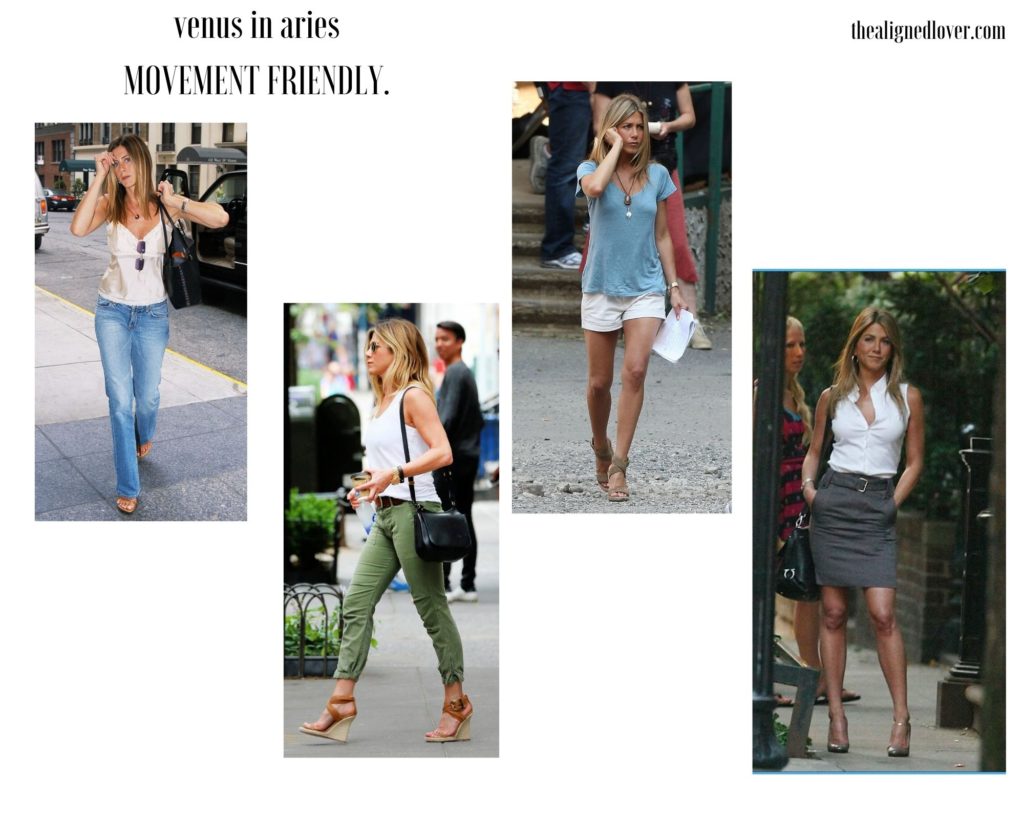 Arguably the queen of casual style, Jennifer Aniston adorns her eternally fit body (thanks to the plethora of Mars-ruled energy) in simple and relaxed garments that support and show off her love of movement.