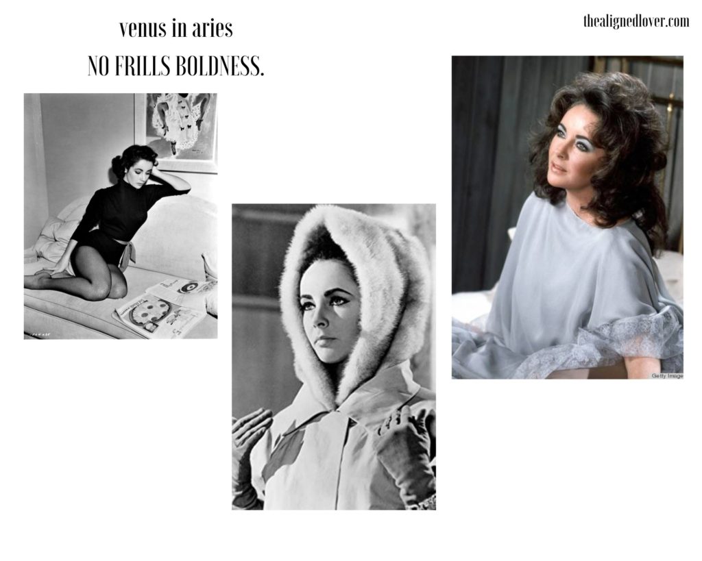 Yes, we all close our eyes and imagine Liz Taylor in her turquoise and gold-colored Cleopatra aura, or close in on her purple eyes, but this Venus in Aries native looks great in to-the-point stark blacks and fur (fur goes well with the Aries-Mars-primal-cavewoman energy. She looks gorgeous in anything decisive and strong, and looks almost too much in anything frilly and ornate.